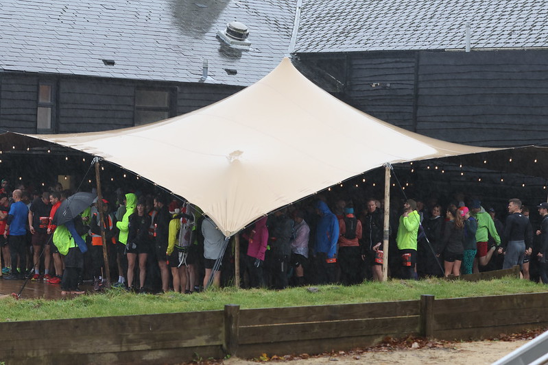 All the runners huddle in this cafe area and there is some surreptitious sharing of photos depicting various checkpoints around the course – photos ‘leaked’ by the marshalls to hint that bog snorkelling will be de rigour if any runner is to make it as far as Checkpoint 11 which looks especially unstable. I glance to the desk where you collect your running number and note a stash of uncollected envelopes. I wonder if I can return my envelope without losing face. All the other runners – including my friends – are cheerful. There is a brisk bin-liner trade and some dry robe comparititis going on. I look at my running pals and realise that neither are considering either throwing in the towel or a DNF. I remind myself that I am well-practised in prat-falling in both mud and rain; I have trained for these conditions – and my training conditions recently have been intemperately ideal.